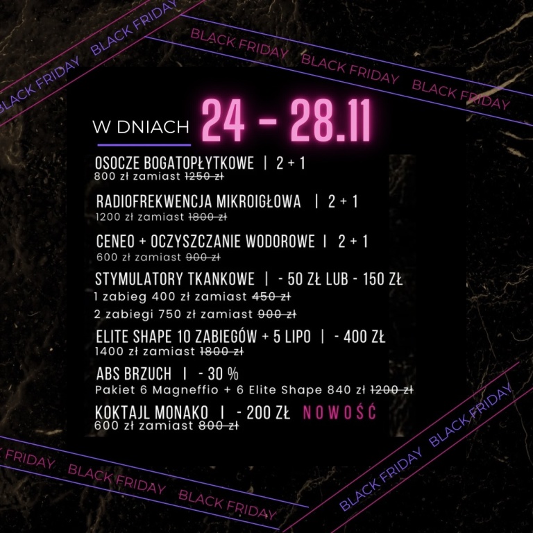 To idealny moment, by zadbać o siebie i skorzystać z wyjątkowych zabiegów w niepowtarzalnych cenach! Nasze promocje Black Friday to prawdziwa gratka dla tych, którzy pragną poczuć się pięknie i luksusowo.