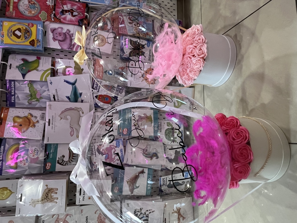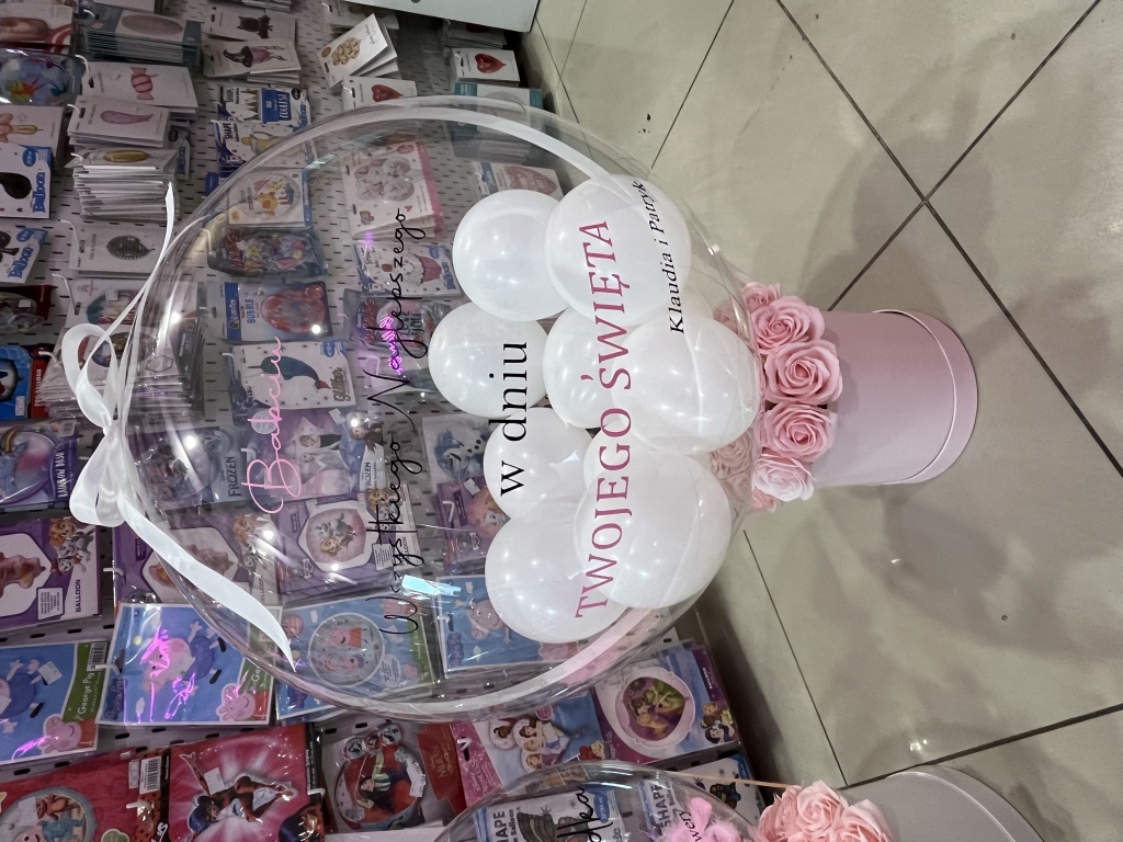 U nas znajdziesz piękne boxy z kwiatami z wosku sojowego oraz różami mydlanymi, połączone z balonem z personalizowanym napisem