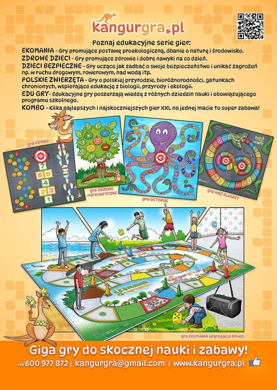 Poznaj edukacyjne gry XXL do budowania postawy ekologicznej u dzieci i dorosłych.Granie to nauka przez zabawę i ruch na wielkich grach planszowych do skakania w wymiarze XXL.Gry z serii EKOMANIA kształtują oraz rozwijają właściwą postawę ekologiczną oraz wiedzę o ekologii i biologii, zwierzętach.Edukacyjne gry wielkoformatowe i maty edukacyjne dla dzieci do nauki, zabawy i skakania od KangurGra.pl to ekologiczna edukacja i pomoc dydaktyczna w szkole i przedszkolu.Eko gry z serii ekologicznej EKOMANIA zawierają zagadnienia z obowiązującego programu szkolnego.Zobacz edukacyjne gry XXL dla dzieci:www.kangurgra.plhttps://kangurgra.pl/kategoria-produktu/seria-ekomania/kangurgra@gmail.com- EKOMANIA czysta energiaGra uczy dzieci wiedzy o odnawialnych i ekologicznych źródłach energii.- EKOMANIA czyste powietrzeGra uczy dzieci jak chronić się przed smogiem, jak dbać o czyste powietrze i dobry klimat.- EKOMANIA segregacja śmieciGra uczy dzieci jak segregować śmieci i dbać o środowisko.- EKOMANIA czysta wodaGra uczy dzieci jak chronić zasoby wody na ziemi i jak dbać o naturę i czystą wodę.- EKOMANIA ocieplenie klimatuGra uczy dzieci wiedzy o ociepleniu klimatu, ziemi, geografii i przyrodzie.- EKOMANIA LASGra uczy dzieci wiedzy o lesie, ekosystemach i przyrodzie.- CHIŃCZYK segregacja śmieciGra uczy dzieci jak segregować odpady i dbać o naturę.- POLSKIE ZWIERZĘTA / PTAKI / OWADYGra uczy dzieci wiedzy o Polskich zwierzętach i gatunkach chronionych, płazach i gadach.- TWISTER OZE segregacja – zagraj w gimnastyczną grę, która uczy segregacji śmieciJesteśmy producentem i twórcami integracyjnych gier xxl dla dzieci, do skakania.Oferujemy:- wielkie gry edukacyjne dla dzieci do nauki i zabawy, po których można skakać jak kangur- gry podłogowe, ogrodowe, plenerowe do szkół, przedszkoli, na świetlicę (np. klasy, twister, kalkulator, stópki i rączki etc.)- plakaty i maty edukacyjne, maty do animacji dla dzieci- duże GIERKI ogromne i ekologiczne gry stolikowe do szkoły i na świetlicę- eko gry jako klasyczne gry planszowe na prezenty i nagrody- edukacyjne strefy gier XXL dla dzieci i młodzieży- warsztaty z komiksu- warsztaty z projektowania gierhttps://www.kangurgra.pl/warsztaty.html- studio graficzne studiokomik.plGry KangurGra.pl są unikalne, ponieważ są to ręcznie malowane, autorskie projekty polskich artystów na najwyższym poziomie.Gry tworzymy pod okiem pedagogów i specjalistów.Można do gry dodać swoje logo, własne pytania a nawet kod QR – aktywny link.Gry od KangurGra.pl to dla dzieci super nauka i radość, połączone z ruchem i zabawą.Zapraszamy do owocnej współpracy.kangurgra@gmail.comwww.kangurgra.pl600977872www.studiokomiks.pl(studio grafiki, komiksu i reklamy)www.artmedstudio.pl(ilustracje medyczne, naukowe, anatomiczne)