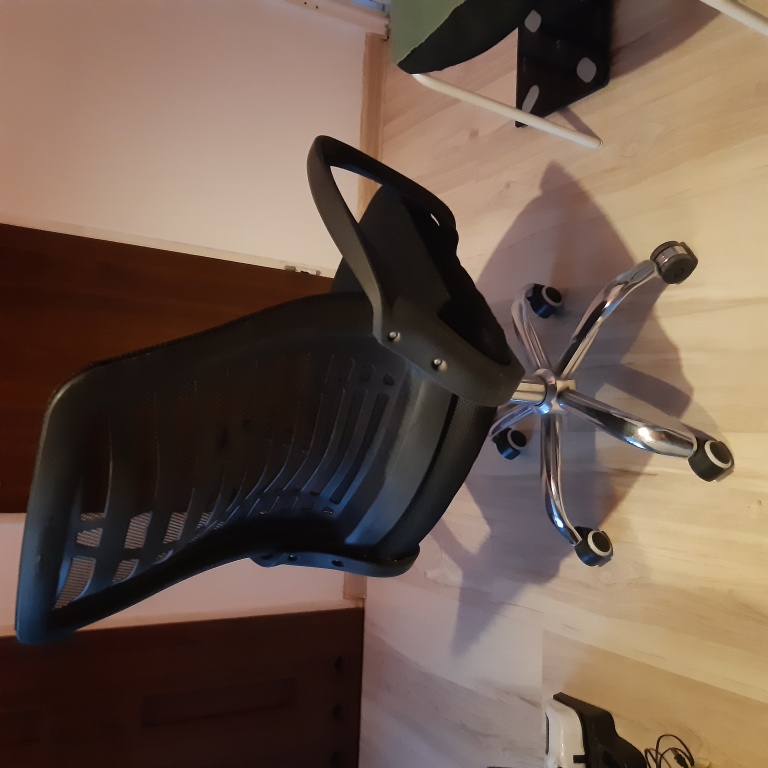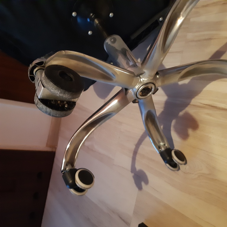 - chromowana, stalowa podstawa jezdna posiada kółka do powierzchni dywanowych (UWAGA! Jedno kółko jest w innym kolorze ponieważ musiałem je wymienić a nie udało mi się dokupić takiego samego - widać to na zdjęciach)