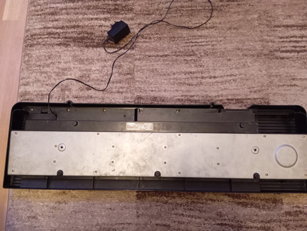 Stan techniczny Keyboard oceniam na dobry ponieważ po podłączeniu do zasilania keyboard działa dobrze. Brakuję tylko 2 plastikowych suwaków (widoczne na zdjęciach) oraz nie widać na zdjęciu - keyboard posiada wejście do zasilacza (nie wiem czy działa) oraz wejście "output".