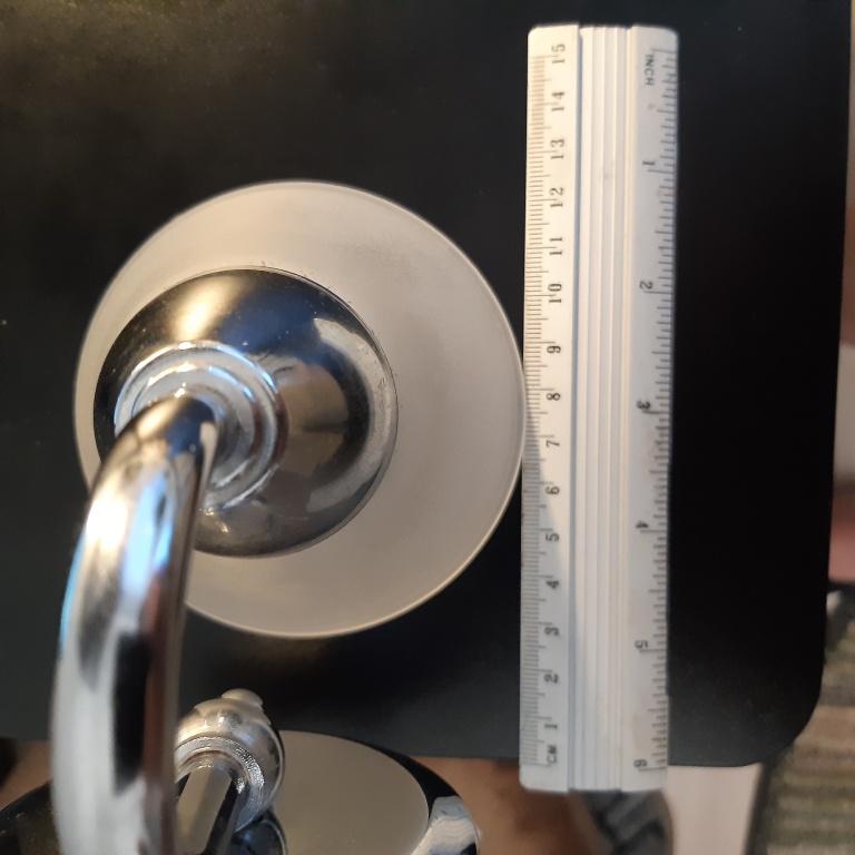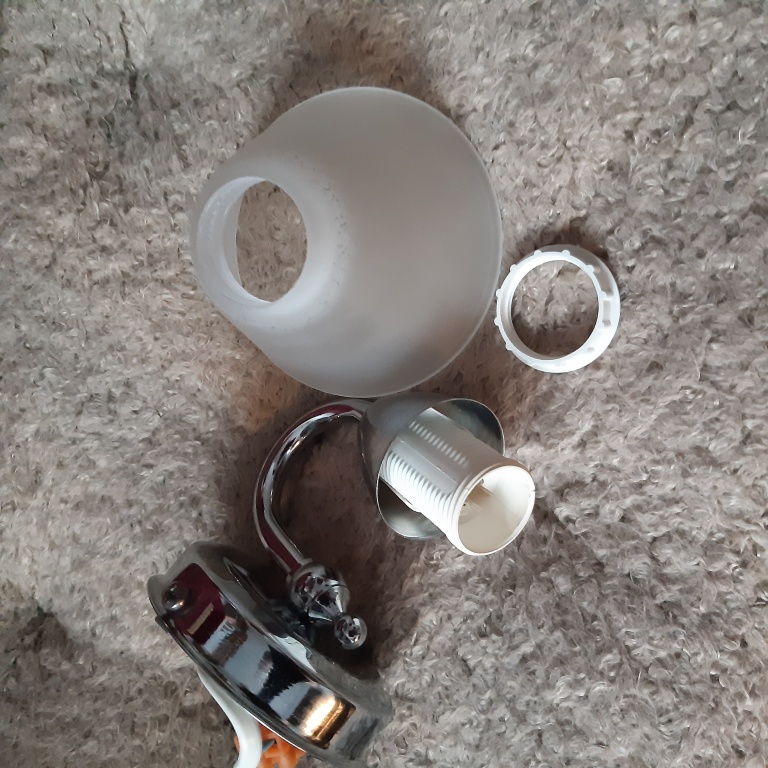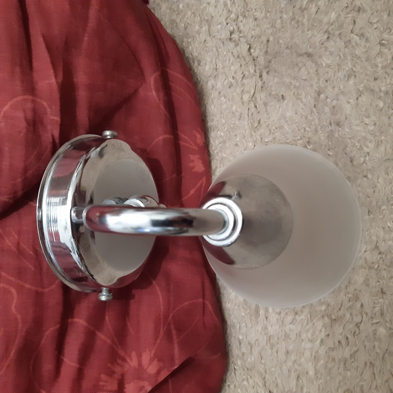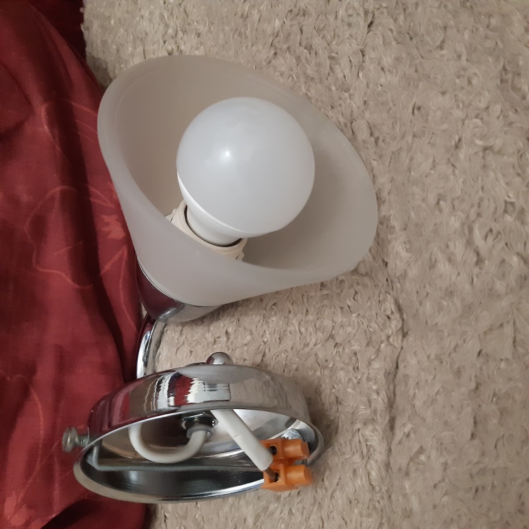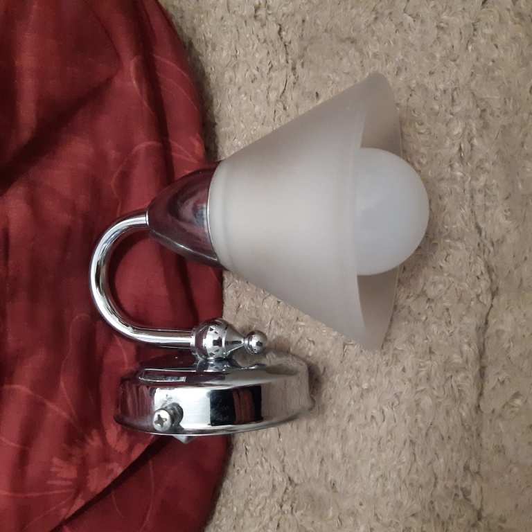 Metalowy kinkiet pokazany na zdjęciach. Oprawka na źródło światła z gwintem E14 (tzw. małym) komplet śrubek do zamocowania i kostka do podłączenia przewodu. Klosz matowany stożkowy o średnicy 95 mm i wysokości 60 mm. Największa odległość od ściany i wysokość całego kinkietu 120 mm. Średnica elementu maskującego na ścianie 80 mm a jego głębokość 20 mm. Maksymalna moc źródła światła 40 W. Certyfikat zgodności CE. Stan wizualny bardzo dobry, żadnych śladów użytkowania, jak wyjęty z pudełka. Źródło światła pokazane w celach poglądowych.