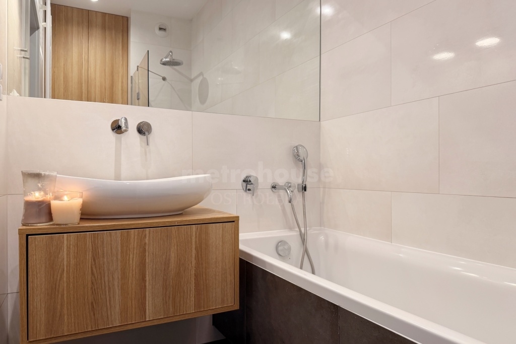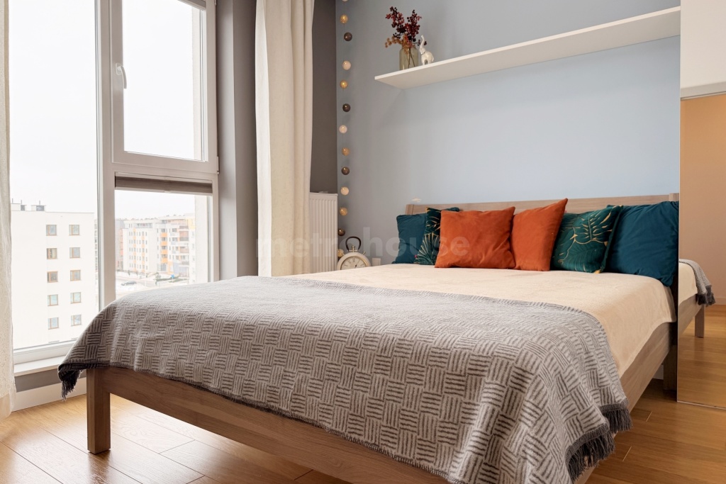 Wnętrze zostało zaprojektowane z dbałością o detale – dominują tu wysokiej jakości materiały, spójna kolorystyka oraz eleganckie wykończenia, które nadają przestrzeni nowoczesny i ponadczasowy charakter. Duże przeszklenia zapewniają doskonałe doświetlenie wnętrz, a wyjście na balkon pozwala stworzyć prywatną strefę relaksu.