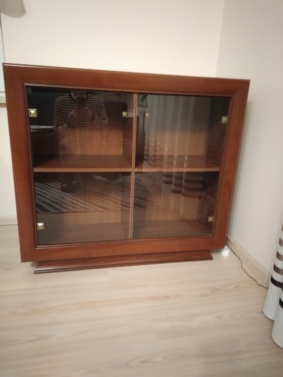 Przeszklona komoda w kolorze ciemnego drewna. Może być wykorzystana do przechowywania naczyń, książek lub dekoracji. Produkt używany, ale w dobrym stanie oraz drewniana komoda rtv w kolorze orzechowym. Posiada dwie szuflady oraz otwartą przestrzeń na sprzęt rtv. Mebel jest w dobrym stanie, może posłużyć jako funkcjonalne i estetyczne rozwiązanie do salonu lub sypialni.