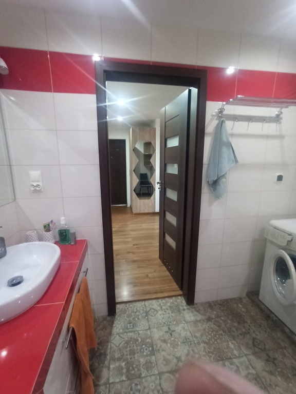 Składa się z salonu z aneksem kuchennym oraz 3 pokoi. Jest częściowo umeblowane. Posiada pełne wyposażenie kuchni (zmywarka, mikrofalówka, płyta gazowa z piekarnikiem elektrycznym, duży stół i 6 krzeseł) oraz łazienki (wanna, umywalka, pralka). Dodatkowo w mieszkaniu znajduje się duże łóżko, kilka komód na ubrania, szafka RTV (telewizor w komplecie) oraz dwie szafy w zabudowie. Do mieszkania przynależy piwnica oraz miejsce parkingowe na zamkniętym (szlaban + pilot) parkingu osiedlowym.