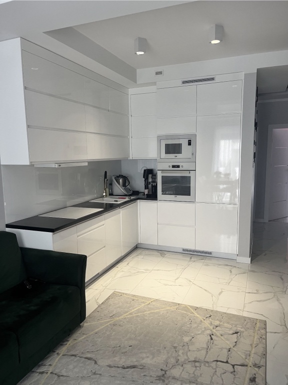Nowoczesna zabudowa kuchenna na wymiar, lakierowane fronty w wysokim połysku, sprzęt AGD w zabudowie. Jasna i elegancka przestrzeń z wyjściem do ogrodu.