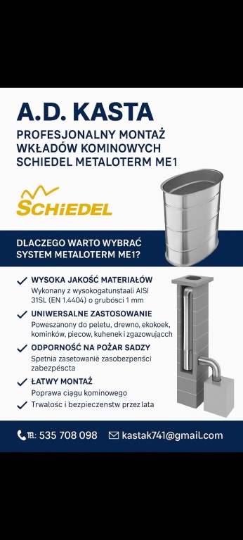 A.D. KASTA oferuje profesjonalny montaż stalowych wkładów kominowych w powiecie ostrołęckim i okolicach. Wykorzystujemy stal kwasoodporną 1.4404 oraz systemy Schiedel ME1, które gwarantują odporność na wysokie temperatury, korozję i działanie kondensatu. Montujemy wkłady okrągłe i owalne, precyzyjnie dopasowane do istniejących przewodów kominowych. Nasze realizacje wyróżniają się szczelnością, estetyką i trwałością. Dzięki dokładnemu montażowi Twój system grzewczy pracuje bezpiecznie, efektywnie i bez ryzyka cofania spalin. Wybierz solidne wykonanie, które zapewni spokój i bezpieczeństwo na wiele sezonów.