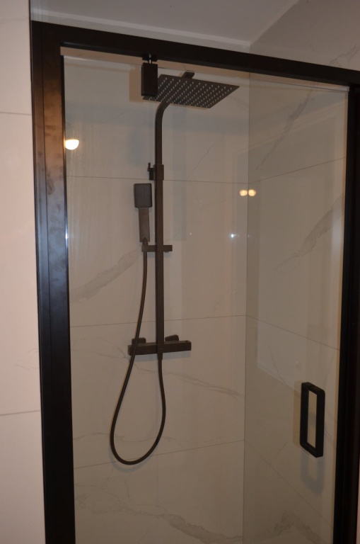 Łazienka w pełni wykończona: szafka z umywalką Cersanit, zestaw podtynkowy Roca, kabina prysznicowa z kolumna prysznicową Cersanit.