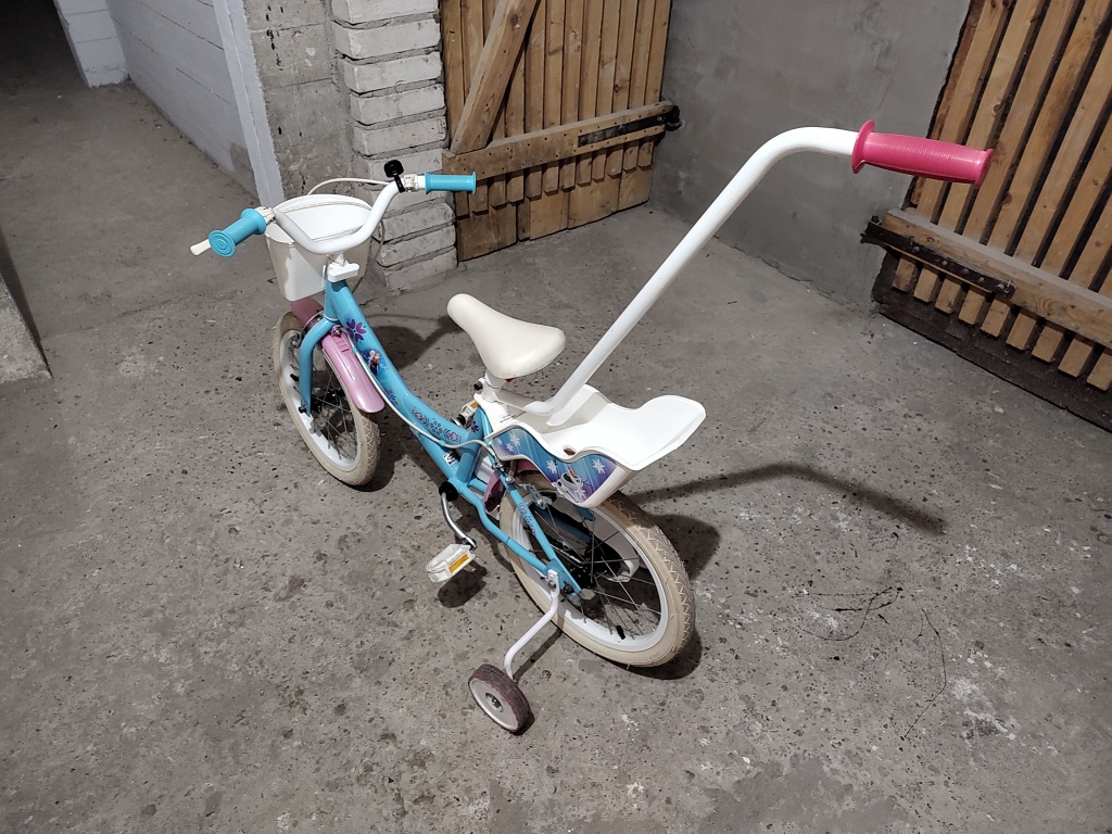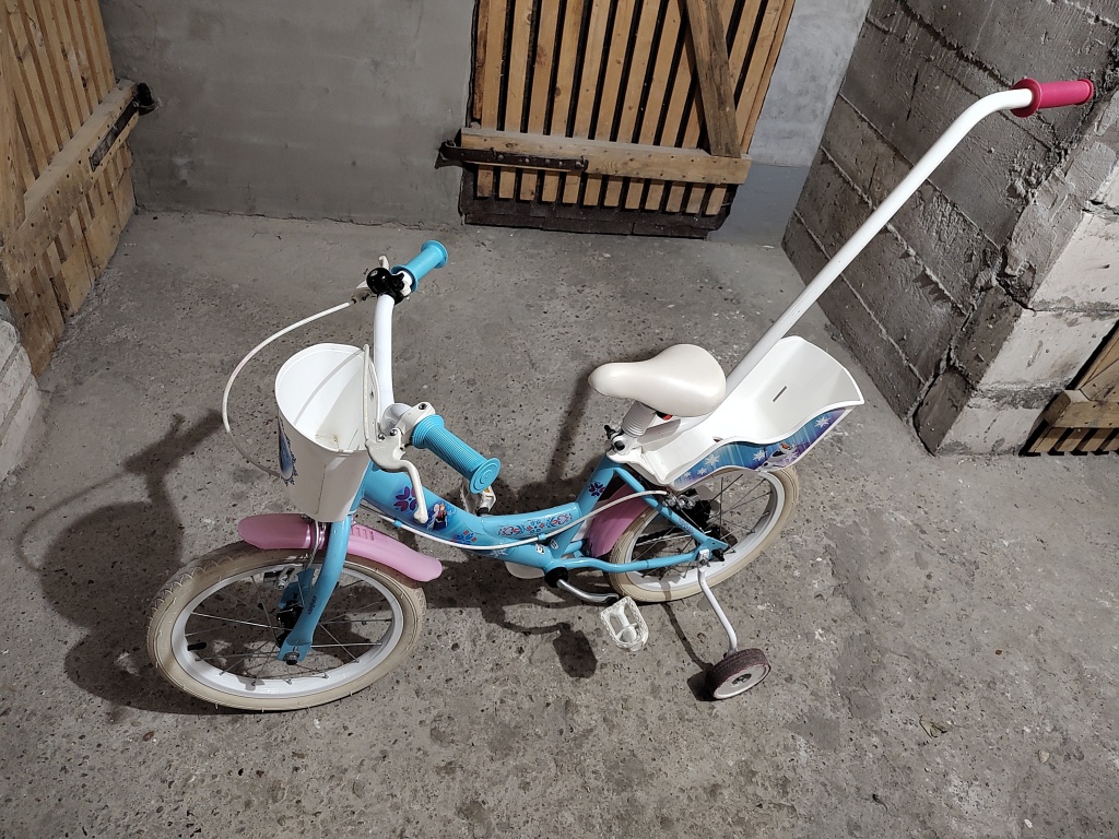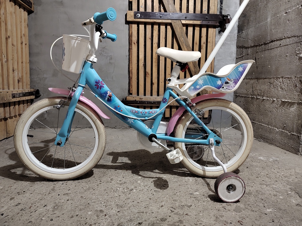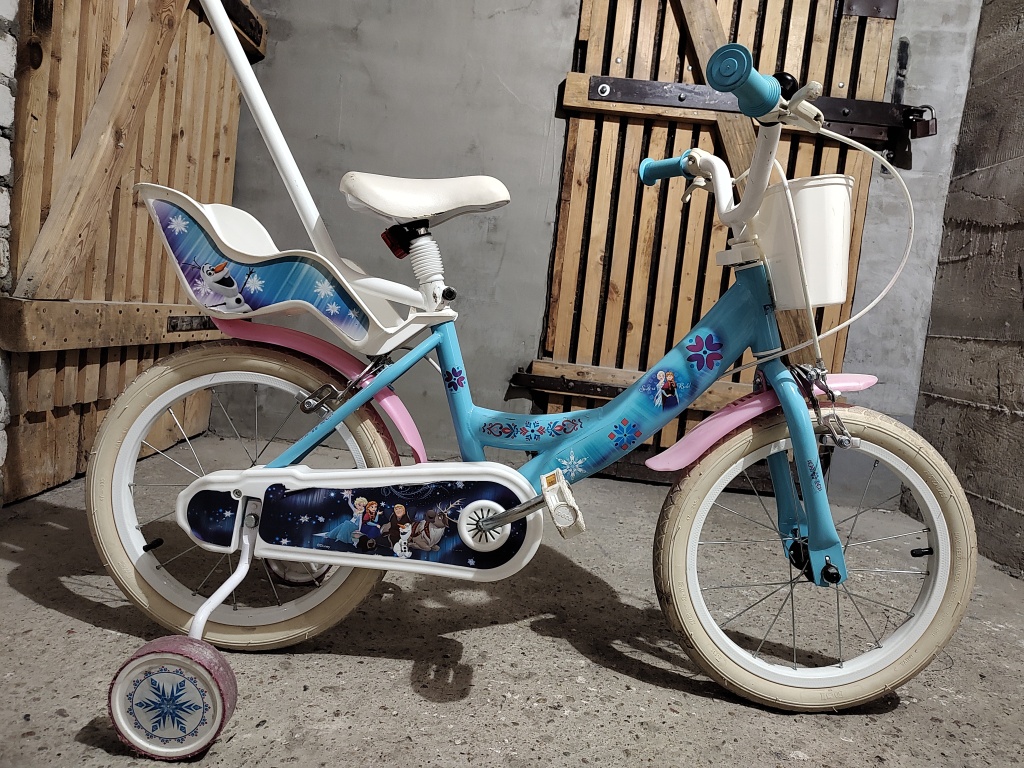 Sprzedam sprawny rowerek dla małej dziewczynki z motywem z filmu kraina lodu. Opony 16 cali