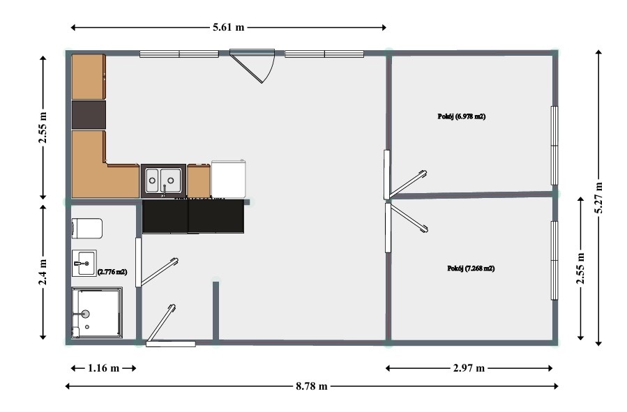 Przestronny salon połączony z kuchnią wyposażoną w nowe sprzęty AGD w zabudowie