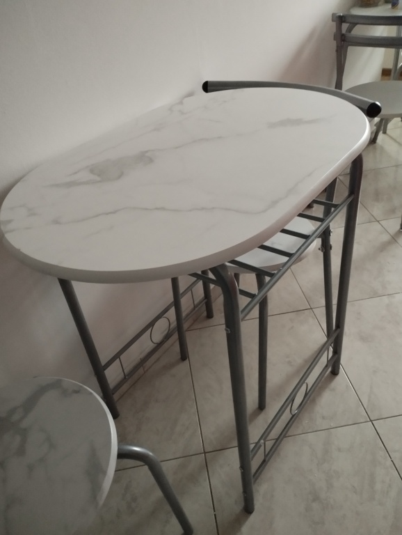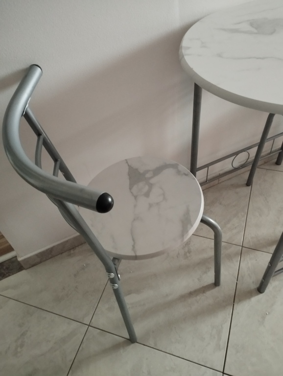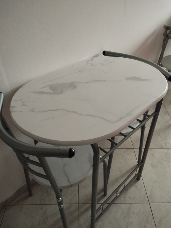 Sprzedam nowy stół kuchenny i dwa krzesła,konstrukcja metalowa ,blat biały z wzorem marmuru,do małej kuchni