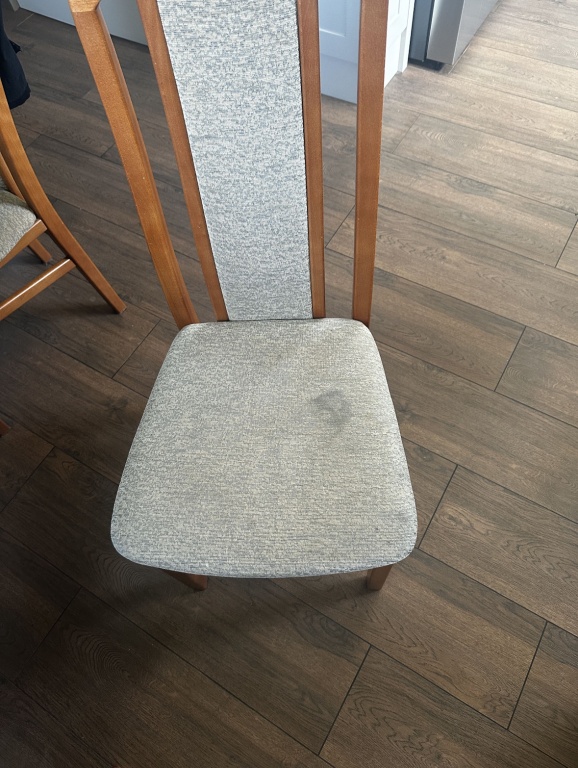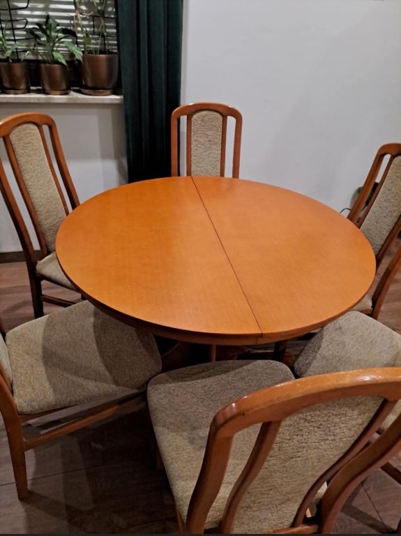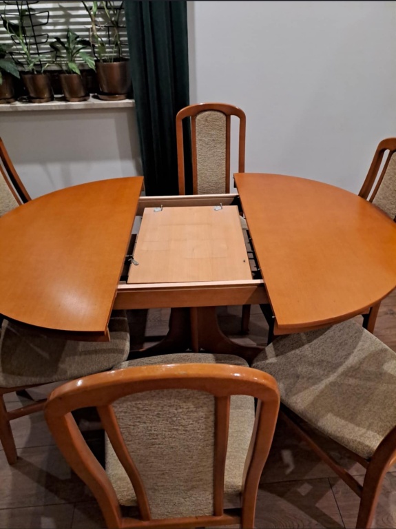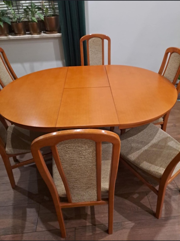Stół drewniany z olchy rozkładany z 6 krzesłami. Stół jest używany zadbany, w bardzo dobrym stanie. Krzesła lekko zniszczone, stabilne(na zdjęciach widać przebarwienia na tapicerce są na 3 krzesłach, reszta czysta). Cena za cały zestaw  550zł do negocjacji . Wymiary : Stoł po rozłożeniu 150/110 Po złożeniu średnica 110 cm. Wysokość 75 cm. Brak możliwości wysyłki i transport. Odbiór osobisty. Kontakt tylko telefoniczny/ SMS