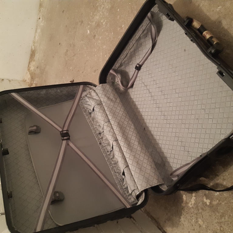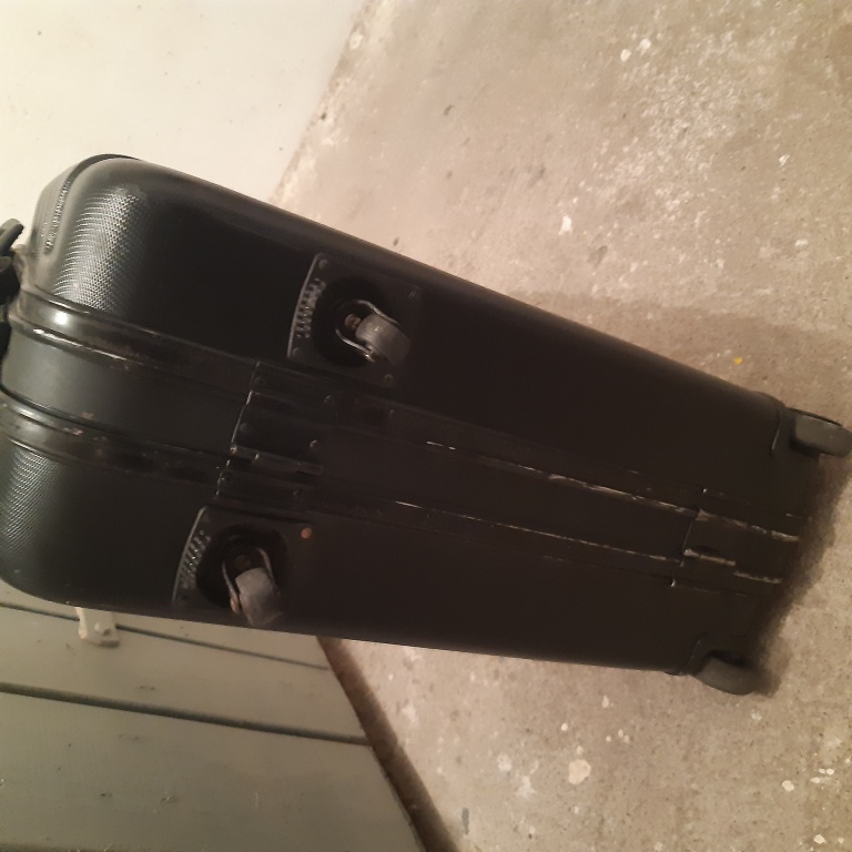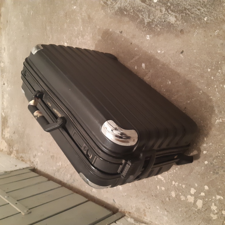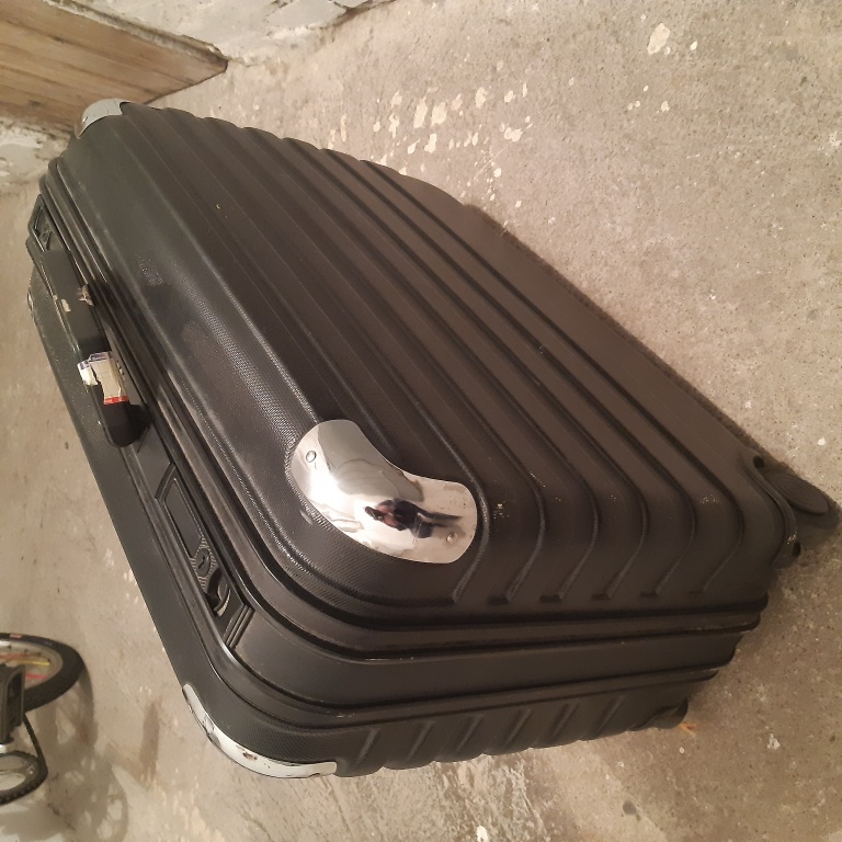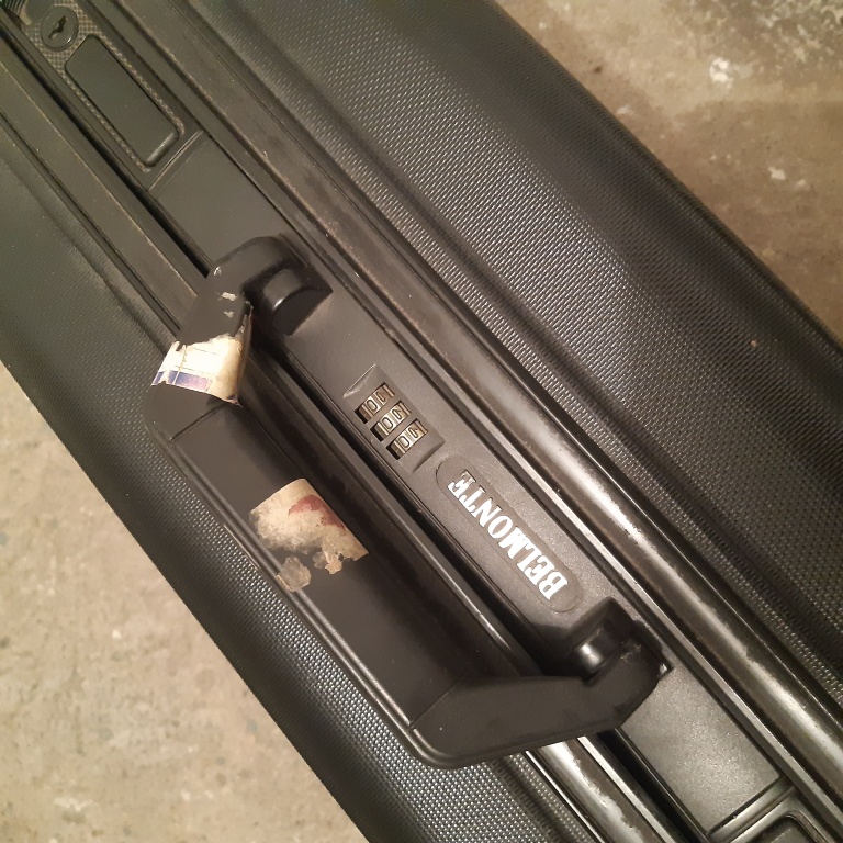 Walizka BELMONTE pokazana na zdjęciach ma zamek szyfrowy, rączkę do przenoszenia, pasek do ciągnięcia na kółkach (dwa kółka skrętne i dwa większe mocowane na stałe), jednokomorowa. Normalne ślady użytkowania , może się przydać np. do przeprowadzki czy przechowywania różnych rzeczy.